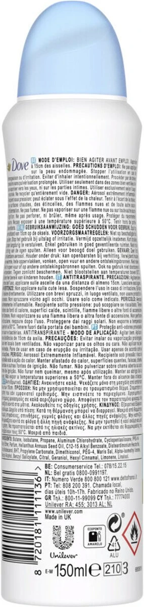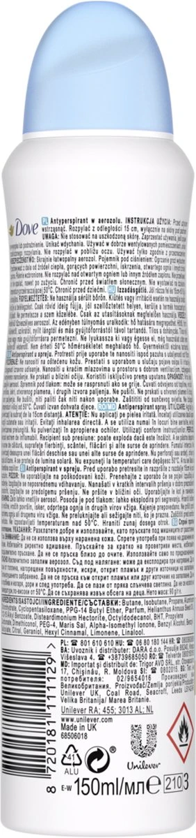 De Dove Care & Protect Antibacterial Anti-Transpirant Deodorant Spray houdt je de hele dag fris. De anti-transpirant heeft een frisse geur en een antibacteriële werking. Zo ruik jij de hele dag lekker fris zonder dat je je druk hoeft te maken over ongewenste luchtjes. Maar het is niet alleen de friss geur die de Dove Care & Protect Antibacterial Anti-Transpirant Deodorant Spray zo’n goede keuze maakt. Onze betrouwbare formule heeft een drievoudige werking: de anti-transpirant biedt tot 48 uur bescherming tegen zweet, bevat 1/4 hydraterende crème met 100% natuurlijke oliën en helpt om je gevoelige huid te herstellen van irritatie veroorzaakt door het scheren. Je krijgt prachtig zachte en gladde oksels in slechts drie dagen. Dus houd je Dove Care & Protect Antibacterial Anti-Transpirant Deodorant Spray in de buurt als je ’s ochtends uit de douche stapt en houd je oksels zacht en verzorgd met Dove anti-transpirant.