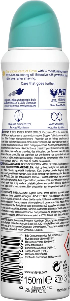 Dove biedt naast anti-transpiranten ook deodoranten aan. Beide geven een langdurig fris gevoel en hebben een verzorgende werking voor de kwetsbare okselhuid. Anti-transpiranten bevatten aluminiumzouten die de hoeveelheid zweet verminderen en ervoor zorgen dat je oksels droog blijven, zodat onaangename geurtjes geen kans krijgen. Deodoranten bevatten geen aluminiumzouten, maar wel actieve ingrediënten die ongewenste geurtjes bestrijden. Beide formules zijn vrij van alcohol en verrijkt met de unieke 1/4 hydraterende crème van Dove. Dus welke je ook kiest, je kunt altijd vertrouwen op bescherming, frisheid en heerlijk zachte, gladde en verzorgde oksels. Om de impact op het mileu te verminderen hebben de Dove anti-transpiranten en deodoranten een andere verpakking gekregen. Onze spuitbussen worden gemaakt van 25% gerecycled en oneindig recyclebaar aluminium, met ecolabel.
