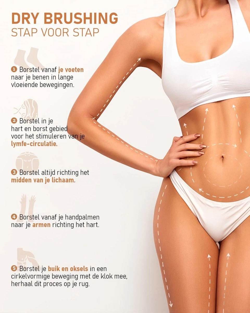 Dry brushing is niets meer of minder dan het ‘droog’ borstelen van uw huid. Bij dry brushing gebruikt u de borstelharen om strijkende en ronddraaiende bewegingen te maken op de droge huid. Het is een snelle, simpele en efficiënte manier om uw huid een schitterende boost te geven.