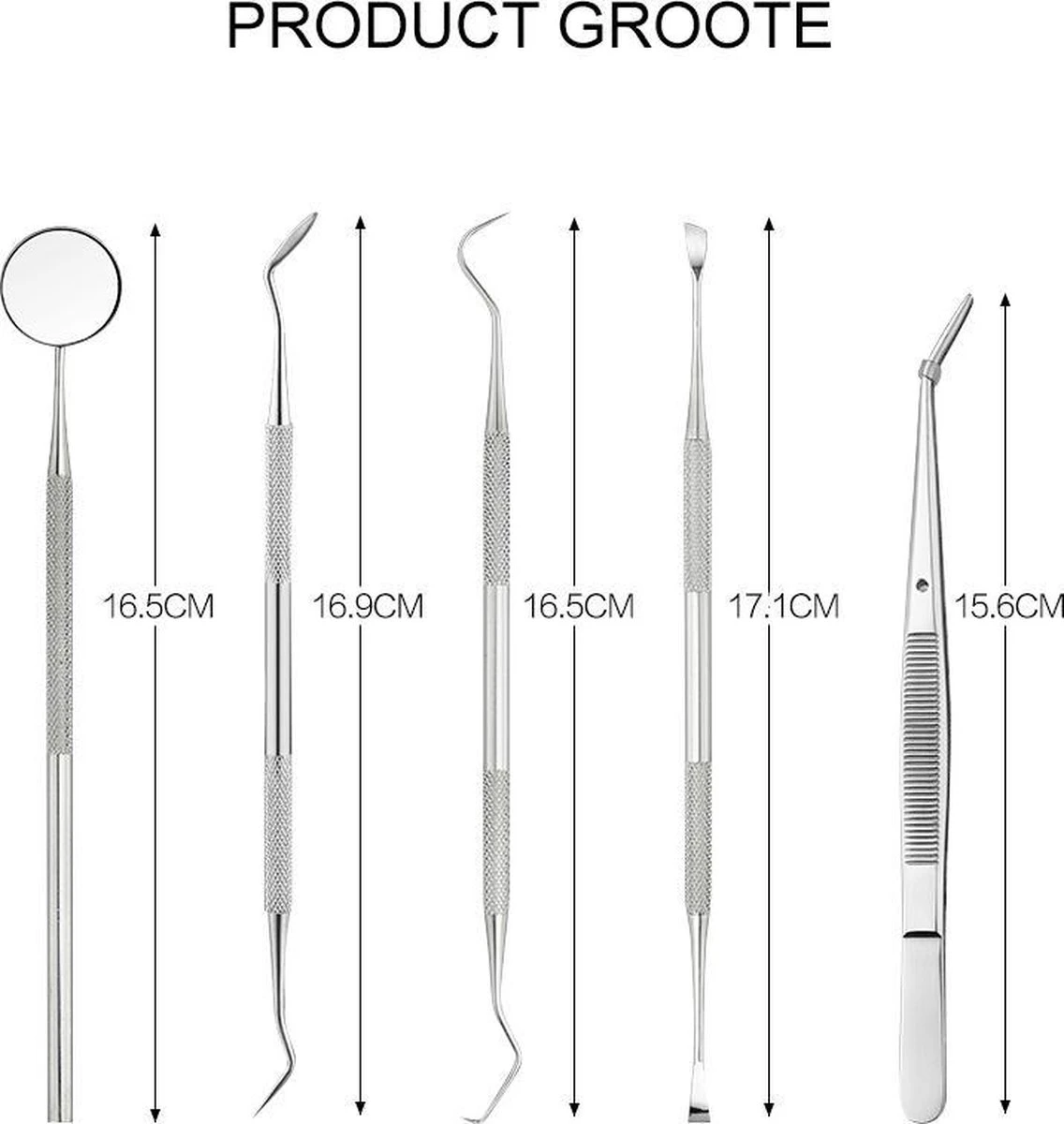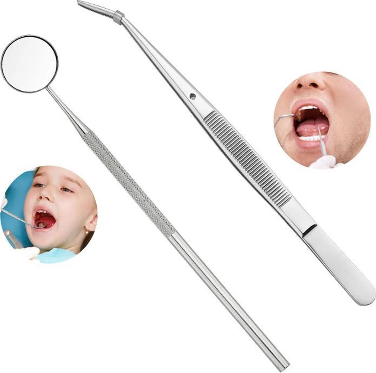 Let op: Deze set is geen vervanging van een tandartsbezoek of een oplossing als u twijfelt over de gezondheid van uw gebit. Bij twijfel, raadpleeg dan een tandarts. Reinig en ontsmet deze set regelmatig en deel hem niet met andere personen.