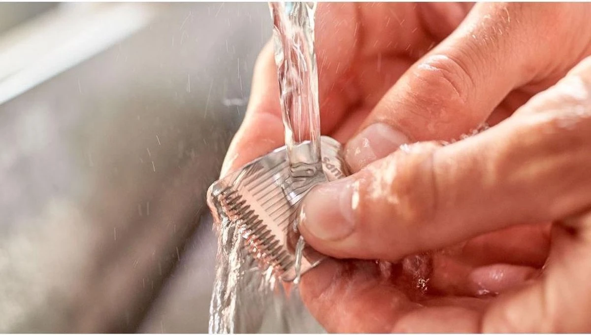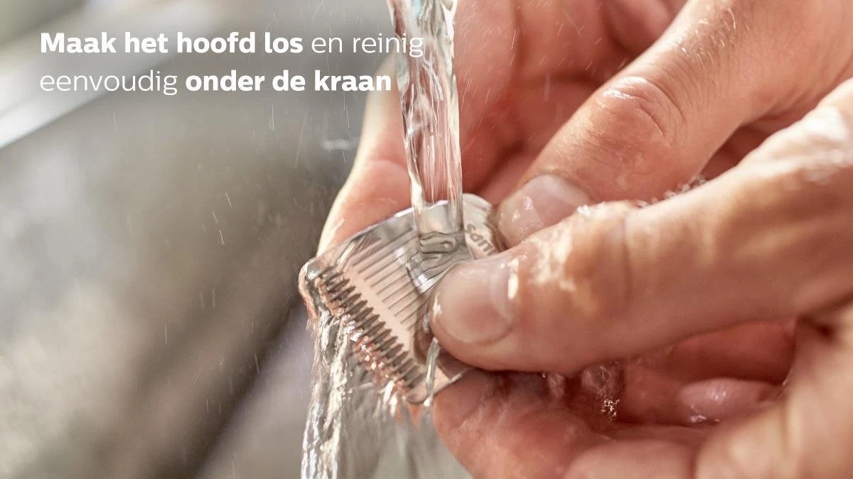 De messen en de kam kun je eenvoudig onder de kraan afspoelen, voor een grondige reiniging.
