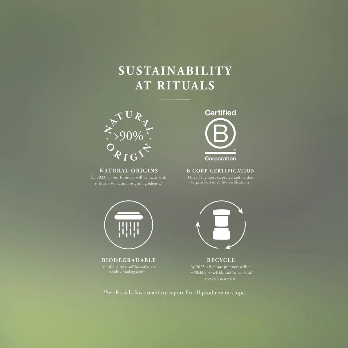 Bij Rituals is het welzijn van onze klanten net zo belangrijk voor ons als dat van onze planeet. Door voor een van onze navulverpakkingen te kiezen in plaats van een nieuw product te kopen, helpt u verpakkingsmateriaal, in andere woorden: water, energie, en CO2, te besparen. Dat betekent dat er minder afval naar de vuilstort gaat, en dus een duurzamere planeet. Om een ​​positieve bijdrage te leveren aan de wereld, zet Rituals zich vrijwillig in voor het planten, beschermen of onderhouden van een boom voor elke verkochte navulling. Ons doel is om tegen eind 2022 samen met onze partners vijf miljoen bomen wereldwijd te ondersteunen. Join the refill movement now!
