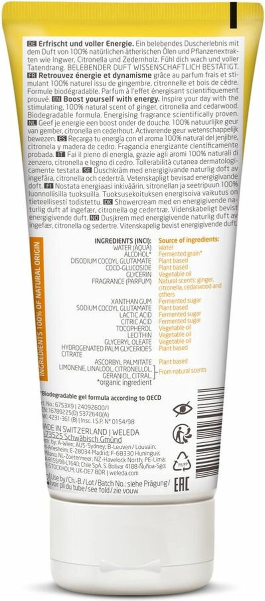 Aroma Shower Energy met natuurlijke etherische oliën heeft een bewezen activerende werking op je gemoedstoestand en gevoel. Geef je energie een boost met de 100% natuurlijke geur van gember, citronella en cederhout. Aroma Shower Energy is 100% natuurlijk, alle ingrediënten komen rechtstreeks uit de natuur. Deze milde douchegel is op basis van 100% plantaardige stoffen die de huid zacht reinigen en niet uitdrogen. Na het douchen voelt je huid aangenaam en soepel aan.