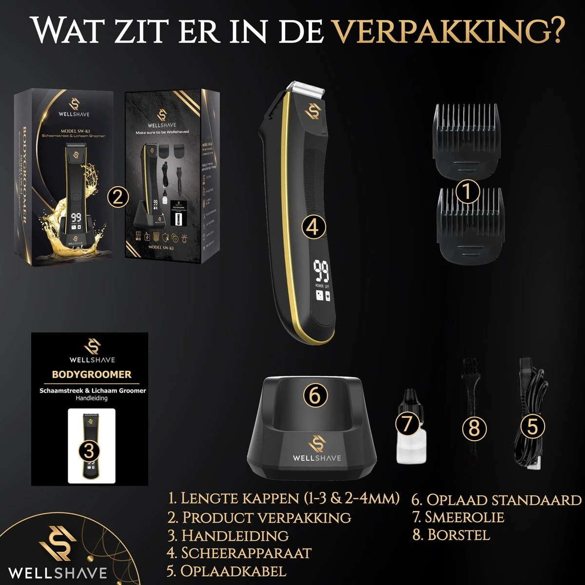 - De Wellshave Trimmer Luxe heeft een LED-scherm waarmee de batterijstatus exact afgelezen kan worden en welke modus actief is. Wanneer de trimmer opgeladen moet worden, kan deze draadloos opgeladen worden door deze op het oplaadstation te zetten. De trimmer kan ook direct opgeladen worden met een kabel. Dankzij de verstelbare opzetstukken zijn meerdere opzetstukken niet langer nodig. De opzetstukken kunnen eenvoudig verschoven worden voor de ideale haarlengte.